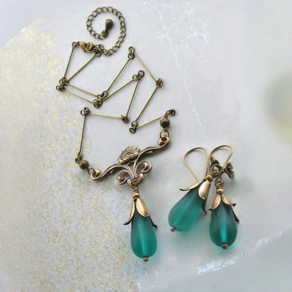 Delicate blossoms come to life in this floral necklace and earrings set, inviting you to embrace a narrative of soft charm. The intricately designed motifs reflect the serene beauty of nature in a harmonious palette of blue and green, expertly crafted from frosted glass alloy. With the pendant draping gracefully and earrings echoing the floral theme, this set enhances any ensemble with a whisper of nostalgic elegance. Perfect for evoking romance at a garden soirée or a quiet evening under the stars.