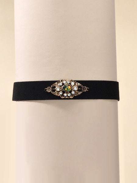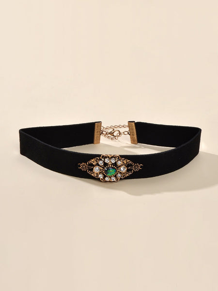 Introducing the Draupine Necklace, a breathtaking adornment that weaves together romance and elegance. This delicate piece features black velvet gracefully layered with antique gold roses, creating a stunning contrast that enchants the eye.