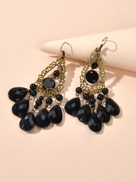 Bohemian Retro Jewellery Black Water Drop Beads Antique Gold Chandelier Earrings-1