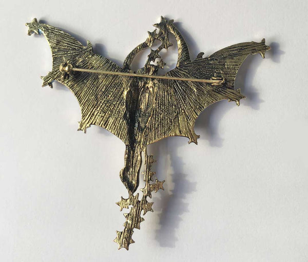 Inspired by a piece initially designed at the turn of the last century. It features a winged lady taking flight among the moon and stars. The brooch is approximately 2 inches by 3 inches.