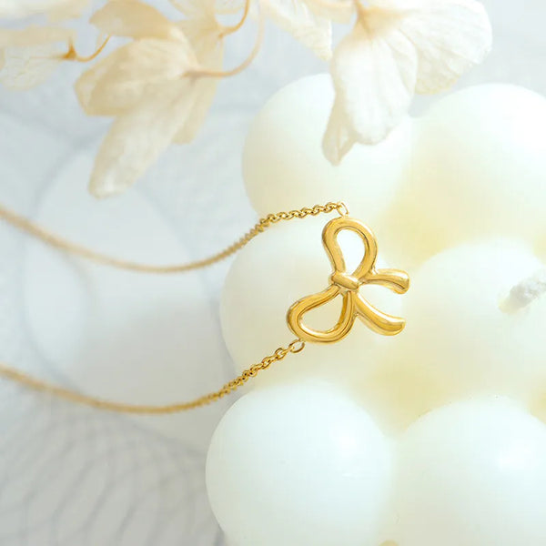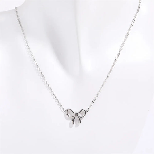 Add a charming twist to your style with the Bow Pendant Necklace. Featuring a delicate bow-shaped pendant, this necklace brings a playful and sweet touch to any outfit. Its lightweight design makes it perfect for layering or wearing solo to brighten your day. Let this necklace be your go-to accessory for a fun and flirty look that never goes out of style.