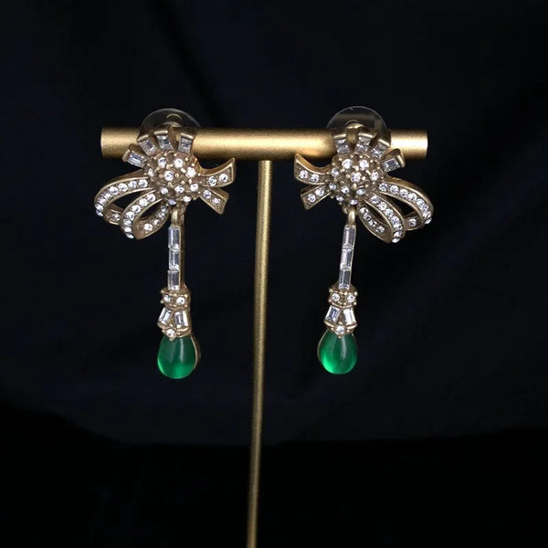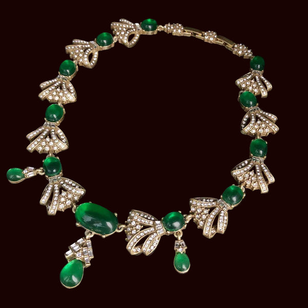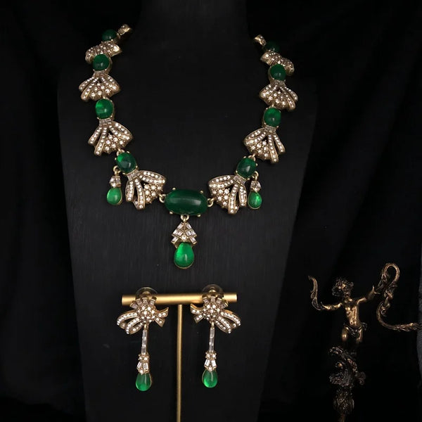 This striking faux emerald set features architectural palace-inspired geometry, designed to command attention at formal occasions and memorable entrances. The coordinated necklace and earrings deliver refined elegance with a bold, statement-making presence that elevates any evening ensemble.