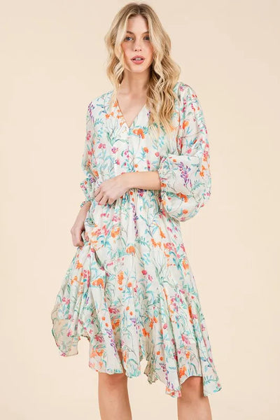 Make a fashion statement in this floral cinched waist balloon sleeve V-neck dress. The floral print adds a touch of femininity and charm to the dress. The cinched waist creates a flattering silhouette that accentuates your curves. The balloon sleeves add a trendy and stylish element. Perfect for a special occasion or a romantic date night. Embrace a chic and elegant look with this gorgeous dress.