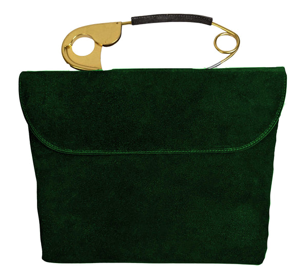 The "Renata" 1940s-50s Style Suede Safety Pin Bag embodies a timeless elegance that appeals to those who appreciate vintage fashion. Crafted from exquisite black suede, this handbag is adorned with a striking gold-tone safety pin handle, which is both functional and a statement piece. For added comfort, a soft suede strip gracefully envelops the handle, allowing for easy carrying.