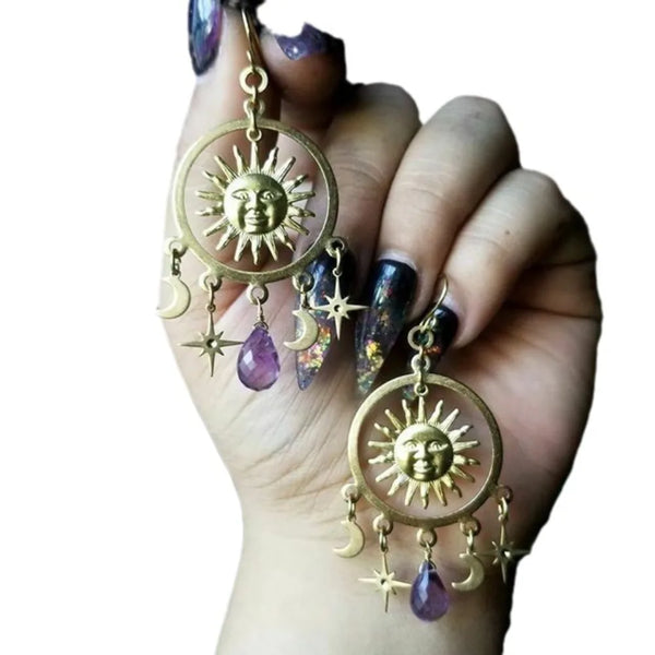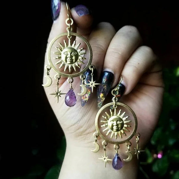 Sun-face earrings with moon and star amethyst-style drops bring mystical, boho magic to festival and night looks.