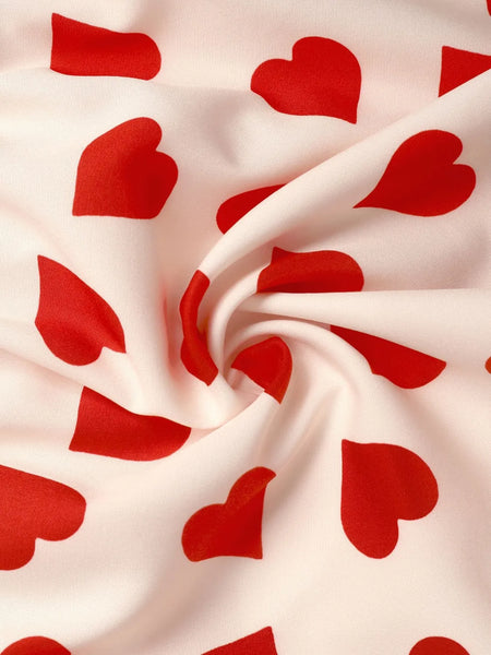 This charming peplum blouse features an all-over heart print pattern in red against a white background, creating a sweet and romantic look. The design includes a statement bow at the front, flutter cap sleeves, and a flattering peplum hem that adds feminine flair. Made from lightweight fabric suitable for warm weather wear, this blouse combines comfort with style. The sweetheart neckline and fitted waist create a figure-flattering silhouette. Perfect for casual outings, date nights, or Valentine's Day celebrations. The versatile design can be paired with jeans, shorts, or skirts for various styling options.