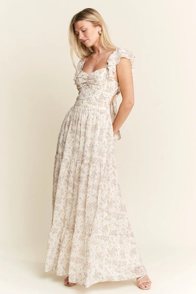 This enchanting maxi dress features a delicate floral print on a light, flowing fabric. The romantic design includes flutter cap sleeves with feminine ruffle details and a flattering sweetheart neckline. The empire waist creates an elegant silhouette, while the tiered maxi-length skirt adds movement and grace. Made from soft, breathable material perfect for warm weather occasions. The neutral beige and white color scheme makes it versatile for various events from garden parties to beach weddings. The dress combines classic feminine elements with contemporary bohemian style.