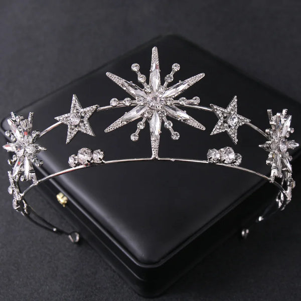 Top your hairstyle with this baroque star headband and feel like a couture bride or pageant queen. Crafted with intricate detailing, the "Baronia" crown features a stunning star design that catches the light from every angle, making you the undeniable center of attention. Whether you're walking down the aisle, competing on stage, or simply channeling your inner royalty, this statement piece elevates any look with dramatic flair and timeless elegance. Perfect for those who refuse to blend in and insist on shining bright.