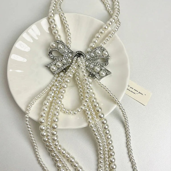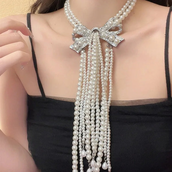 Butterfly bow pearl tassel necklace turns any neckline into a couture runway moment.