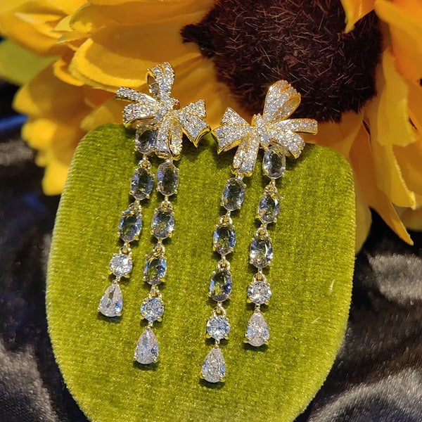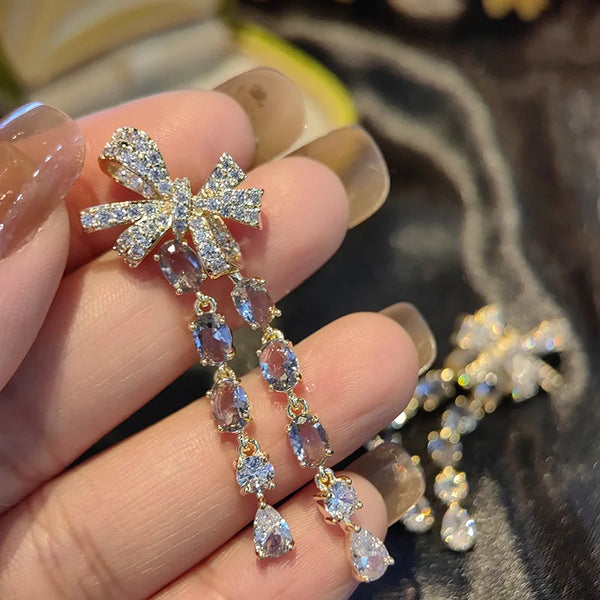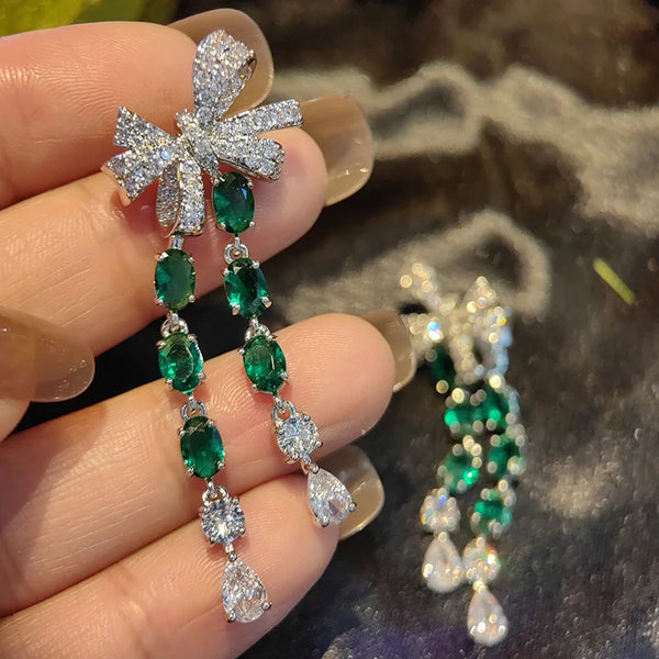 Green bow water-drop earrings with rhinestones are pure ballroom romance, ready for banquets and big nights out.