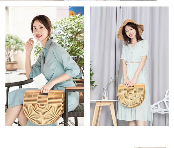 Carry this semi-circular bamboo straw bag and step into every sunny weekend with effortless bohemian style.