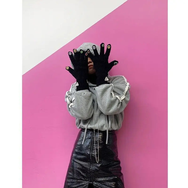 Woolen gloves with sparkling stone detail and chain are warm, trendy, and ready for autumn street style.