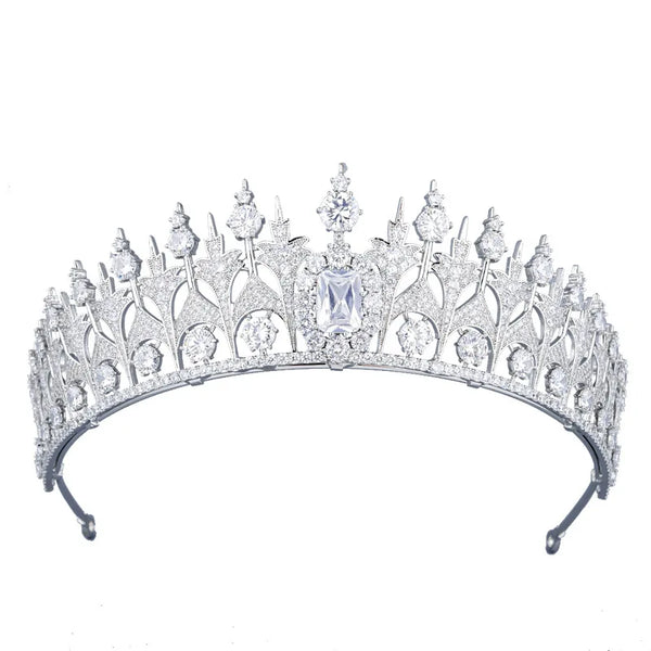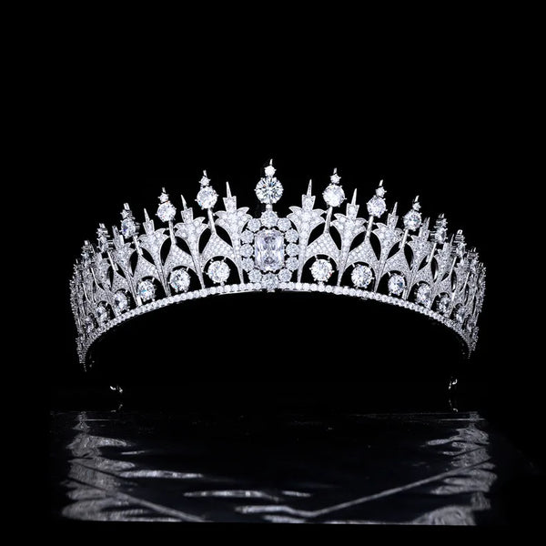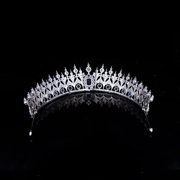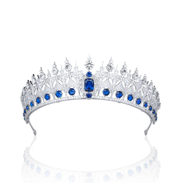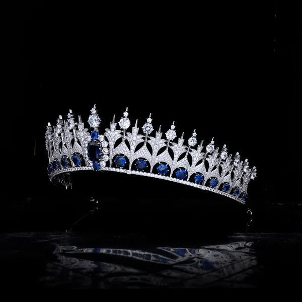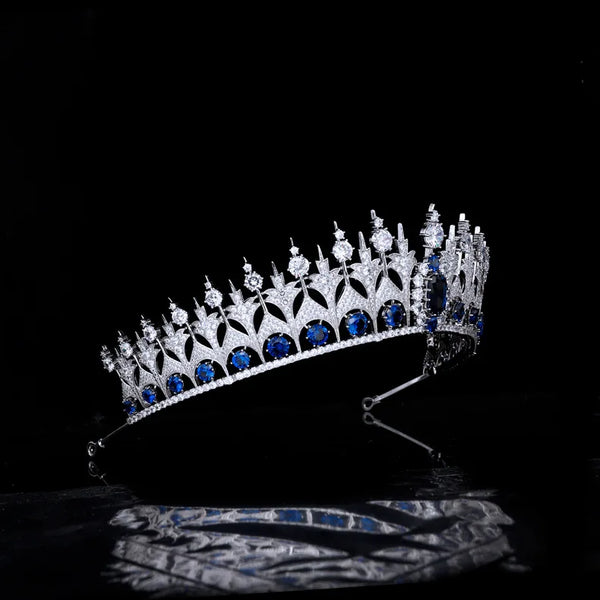 Sapphire-tone bride crown with sparkling stones in copper delivers full royal-bride drama at weddings and formal events.