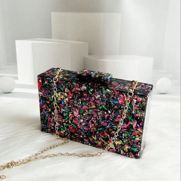 Mixed-color acrylic flap clutch is small but full of designer attitude for crossbody nights.