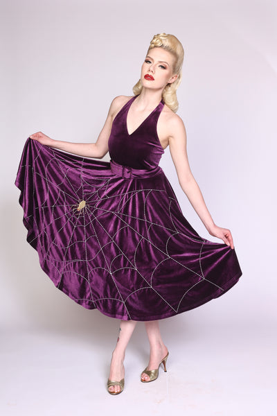 Our exclusive 1950s style Spiderweb Dress. Inspired by an original 1950s vintage piece, this dress boasts a halter neck, fitted waist with matching belt, hand embroidered spider web in silvery thread, and a gold-tone spider with red rhinestone eyes. Available in luxurious inky black stretch velvet. Add a crinoline petticoat for a special flair (not included).