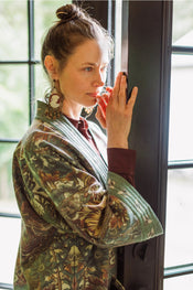 The "Love Grows Wild" Fleece Cottage Cardigan Kimono Jacket is crafted from 100% bamboo wood viscose, offering a refined blend of softness and sustainability. This elegant piece drapes gracefully, providing both warmth and breathability for sophisticated layering.