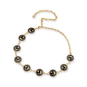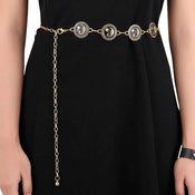 The perfect accent to any look, our "Nadia" Celestial Inspired Belt is crafted to evoke sophistication and elegance. Meticulously designed with vintage-inspired details, this chain belt features enameled medallions of crescent moons and stars, creating an undeniably majestic look. Bestow royalty to your wardrobe with this luxurious and exclusive statement piece.