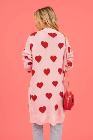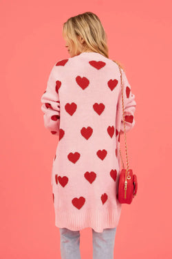 A soft embrace of whimsy and warmth, this open-front layer beckons the dreamers and the seekers. With its playful heart graphic, the fabric dances between comfort and style, inviting you to unfurl your story.