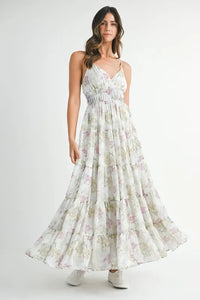 The floral print tiered cami maxi dress is a breezy and feminine piece adorned with a charming floral pattern. Its tiered design adds volume and movement to the dress, creating a flowy and ethereal look. With its cami straps and maxi length, this dress is perfect for warm-weather occasions, offering a stylish and comfortable option for a chic summer outfit.
