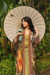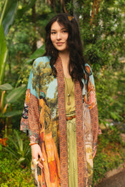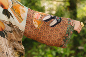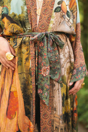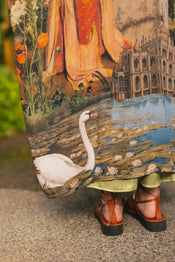 Vibrant, exotic and luxurious — welcome to our secret garden! This imaginative piece features the image of a woman in resplendent dress carrying lilies through her garden, which was painted in 1871. The architectural elements, including the spired chateau and decorative wall panels were painted during the same era, and the charming swan comes from a drawing done in 1580. The beautiful branch with oranges and birds comes from an antique Japanese woodblock print.